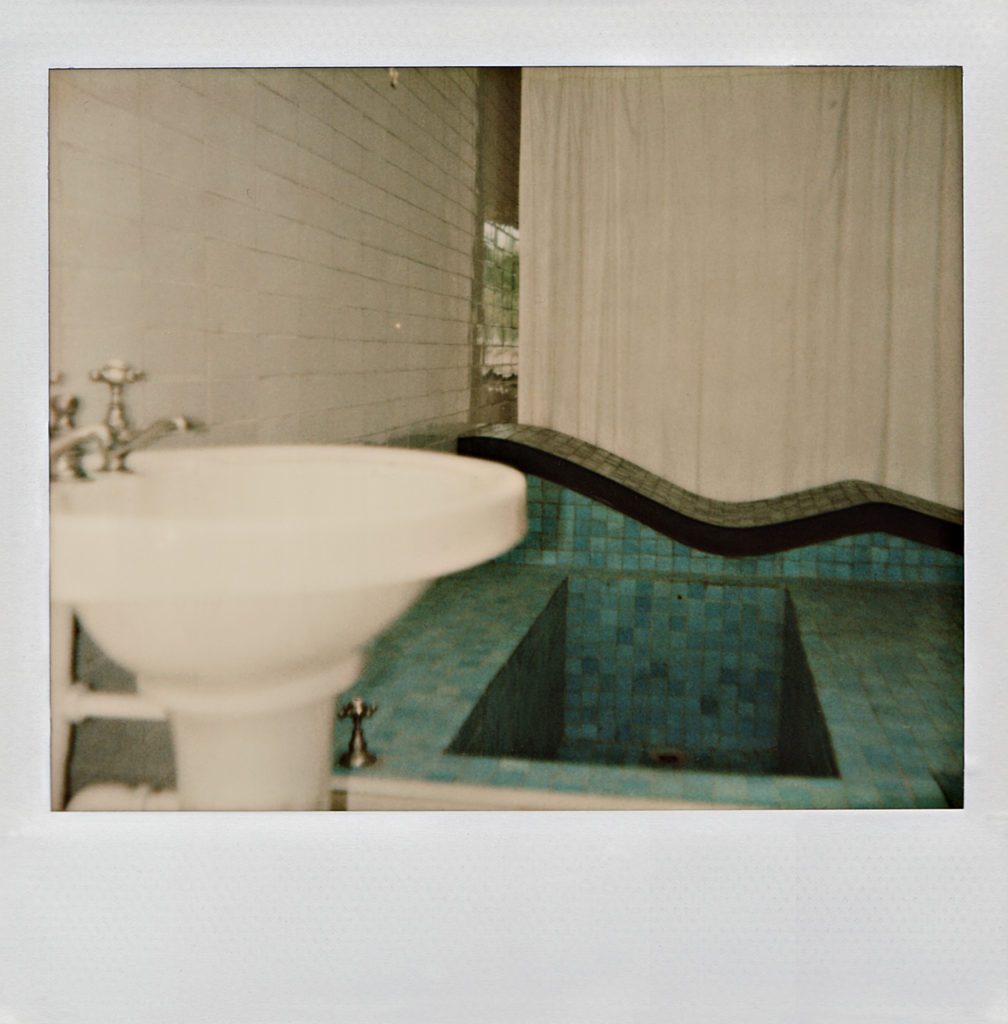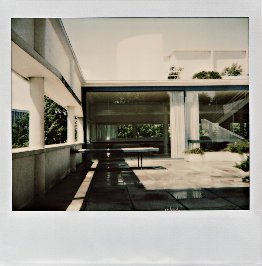 Une première prise de vue reprend le cadrage d’une célèbre photographie de Marius Gravot3, datée 1931, l’année de livraison du bâtiment et d’un format horizontal. Ici la proportion diffère – 9.2 x 7.4 cm., sur un fond carré de 10 x 10 cm. – car c’est l’appareil à développement immédiat qui dicte le cadrage : la rampe ne peut apparaître, mais son reflet l’ajoute à la composition, des rideaux sont toujours suspendus derrière les grands vitrages coulissants4. Le photographe s’est agenouillé et s’est légèrement éloigné par rapport à l’original, la pluie qui vient de tomber est présente, les flaques qu’elle a formées sur les dallettes du sol de la terrasse permet un reflet supplémentaire dans l’image. Tout est pensé pour ne pas « monumentaliser » un sujet devenu depuis sa création une icone5 : le grain, les imperfections, l’imperceptible flou du tirage y participent.